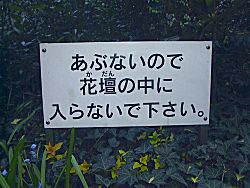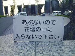 街を歩いていて、「恐ろしい物」を見つけてしまった。何の変哲もない花壇の脇に立っている「看板」である。 「あぶないので 花壇の中に 入らないで下さい」 何て危ない花壇なんでございましょう。高圧電流でも流れているのかしら? 恐る恐る中を覗いてみたけど、それらしきものはない。見た目では分からない、何か「恐ろしい物」があるに違いありません。だって、複数箇所に、この看板が立っているのですもの。 地雷でも埋まっているのかしら? それとも、ここに植えられている植物自体に猛烈な毒性があるため、その危険性を表示しているのかしら? いずれにしても、不気味な看板であります。 |