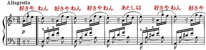 以前、友人のピヤニスト・中畑淳さん(現・福島大学助教授)が、この曲をリサイタルで取り上げました。非常に端正な、美しい演奏でした。それでも第3楽章の主題は、こんなふうに聞こえてしまったのです。打ち上げ飲み会の時、わたくしは言いました。「あの、好っきやねん、実に良かったよ」。一同、きょとん???。「だからさ、あれよ」と、酔っぱらったわたくしは、ピヤノ演奏/教育界の「偉い人たち」が大勢いる中で、歌ってやったのです。